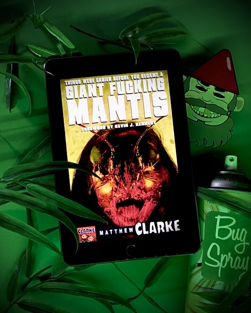 Jacoboby and Millie are sweethearts. Plans for a bright future together begin as each day seems to have a promising outlook. There’s only one small problem, Millie is in the process of transforming into a praying mantis. Now the couple must struggle with everyday living having to take into account their better half is a long-bodied, large-eyed predatory insect. Meanwhile…the SMK (Super Mantis Killas), an established anti-manti clan of humans, continue to perform their ritualistic acts of extreme violence towards manti-persons. Their one and only objective in life is to rid manti-people from the face of the earth. Matthew Clarke blends emotions of metamorphosis terror, carnivorous disgust and bizarre humor into one unsettling skin-shedding orgy of storytelling. From witty manti orientation centers to the concerns of impregnating a loved one without getting your face eaten. Clarke covers every mantid subject matter with tongue in cheek accuracy. Unforgettable cast members are the authors strength in storytelling. From the unique descriptive transformations of losing teeth, fingerprints and hair to the celebrated Tiny Terry, a gnome with a robust desire for the taboo. These adult themed scenarios of green-flecked gore and manti-flesh on flesh are not for the easily offended.
