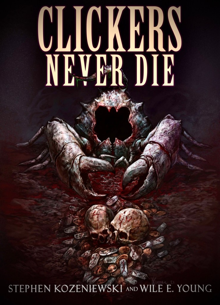 A soldier’s tenure develops into being an isolated castaway on a deserted island with only one other inhabitant. A government coverup leads to mind-melting experimentations of extreme hypotheses involving Eurypterid species. The invasion of Clickers upon Earth have taken many distinctive forms over the years. From the 1940’s to modern day, both military and scientific communities have explored these crustacean phenomenas that lead to unexplored dangerous waters. Originally influenced by Guy N. Smith’s Crab books, authors Stephen Kozeniewski & Wile E. Young have officially received the Clicker baton and are following in the giant footsteps left behind by legendary writers of the series. Their collaboration shines like a beacon of brutality as both imaginative styles mesh successfully as one. Loaded with scorpion like appendaged creatures, lobster-crab monsters and undiscovered beasts of the deep…Clickers Never Die raises the prehistoric specimens bar to a new predatory level.